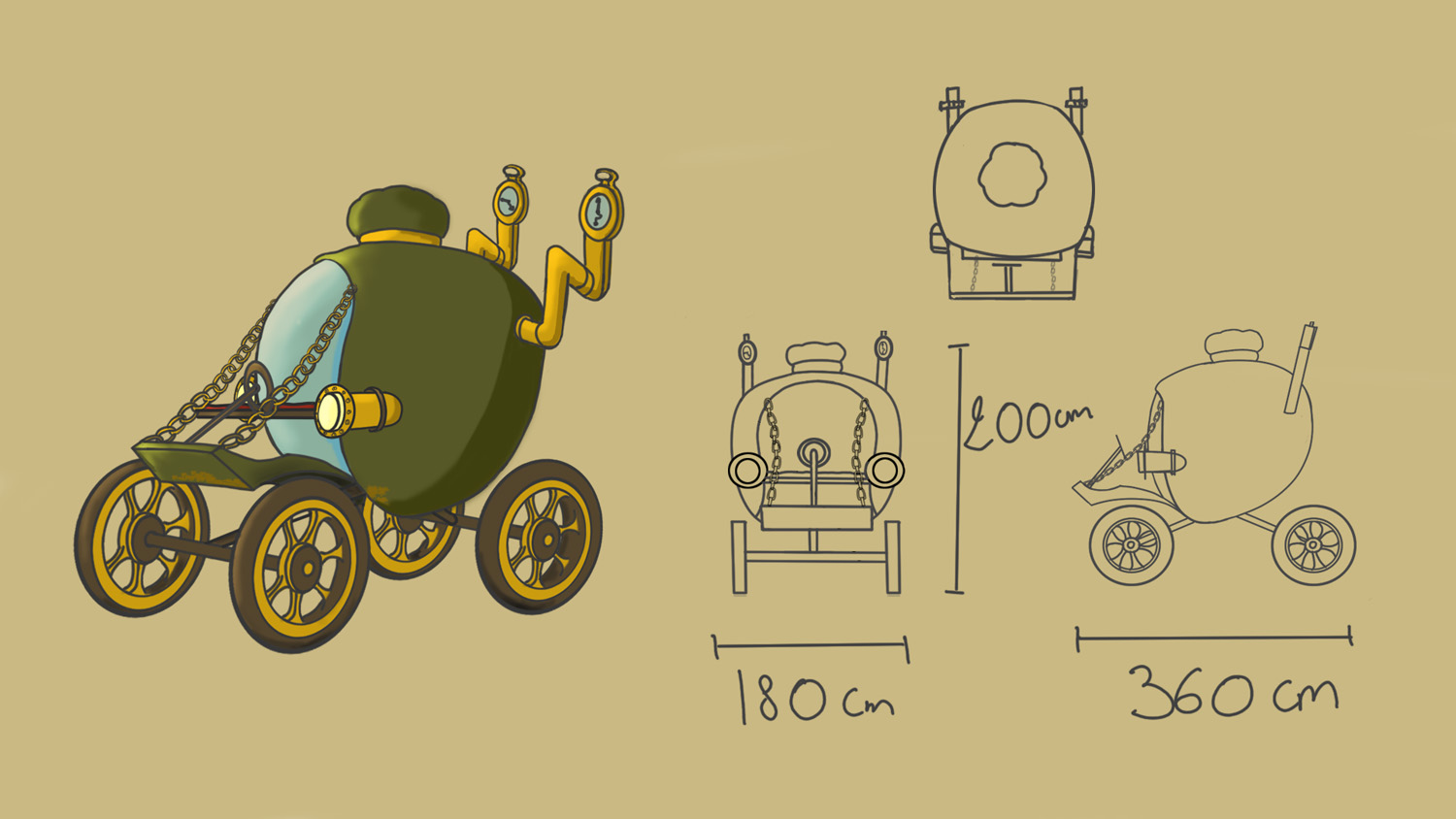 The students were instructed to create a turnaround-style “concept art” board of a semi-realistic Steampunk-style time-traveling vehicle that must be able to roll on the ground.