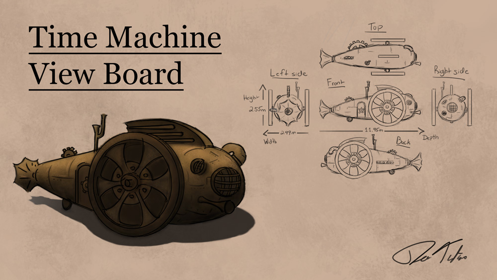 It is in the illustration class of Christine Thibodeau that the students in their second session of 3d animation cinema and visual effects were able to work on this new project. The two groups had to create a “concept art” board with a turn around of a semi-realist Steampunk time machine. The vehicle must be able to roll on the ground.